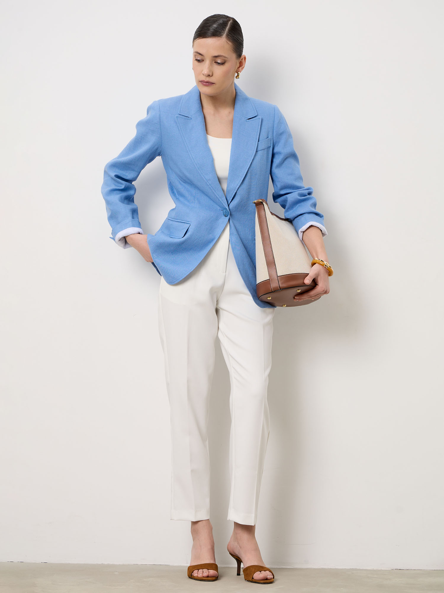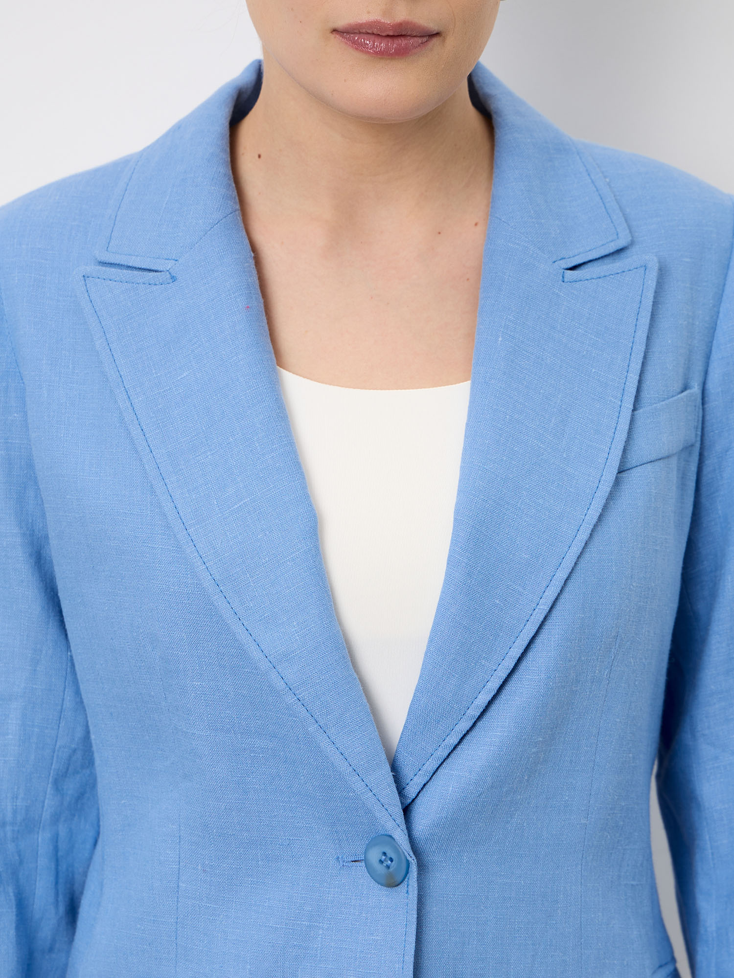 Модель выполнена в классическом стиле с однобортной застёжкой на пуговицу и аккуратным воротником с лацканами. Жакет дополнен функциональными карманами и чёткой линией плеч, что придаёт образу аккуратность и современную элегантность.