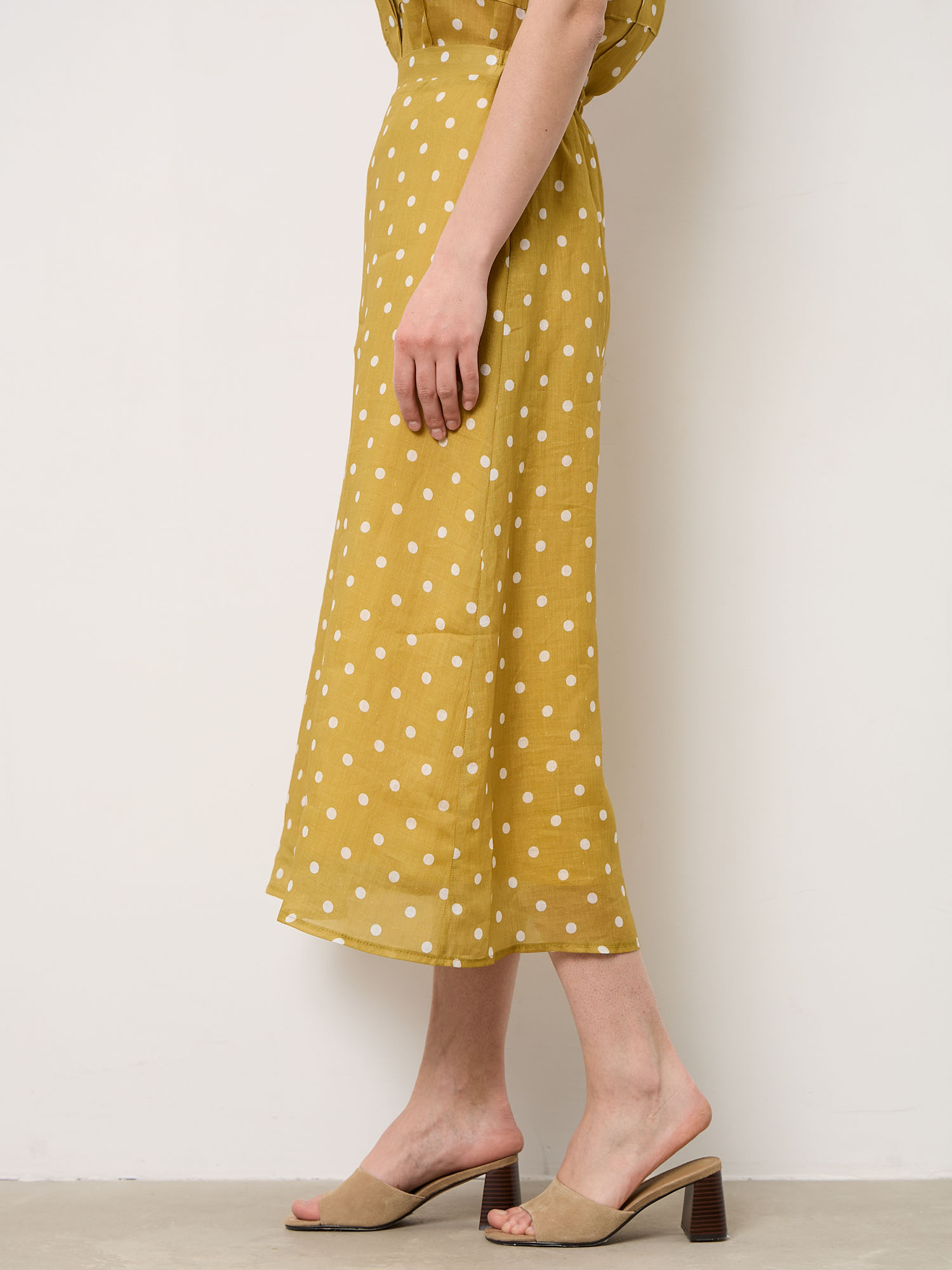 Модель выполнена в длине миди с мягким расклёшенным силуэтом, который красиво движется при ходьбе. Классический принт в горошек придаёт образу лёгкую винтажную нотку. Лаконичный крой подчёркивает натуральную фактуру ткани и делает юбку универсальной для разных образов.