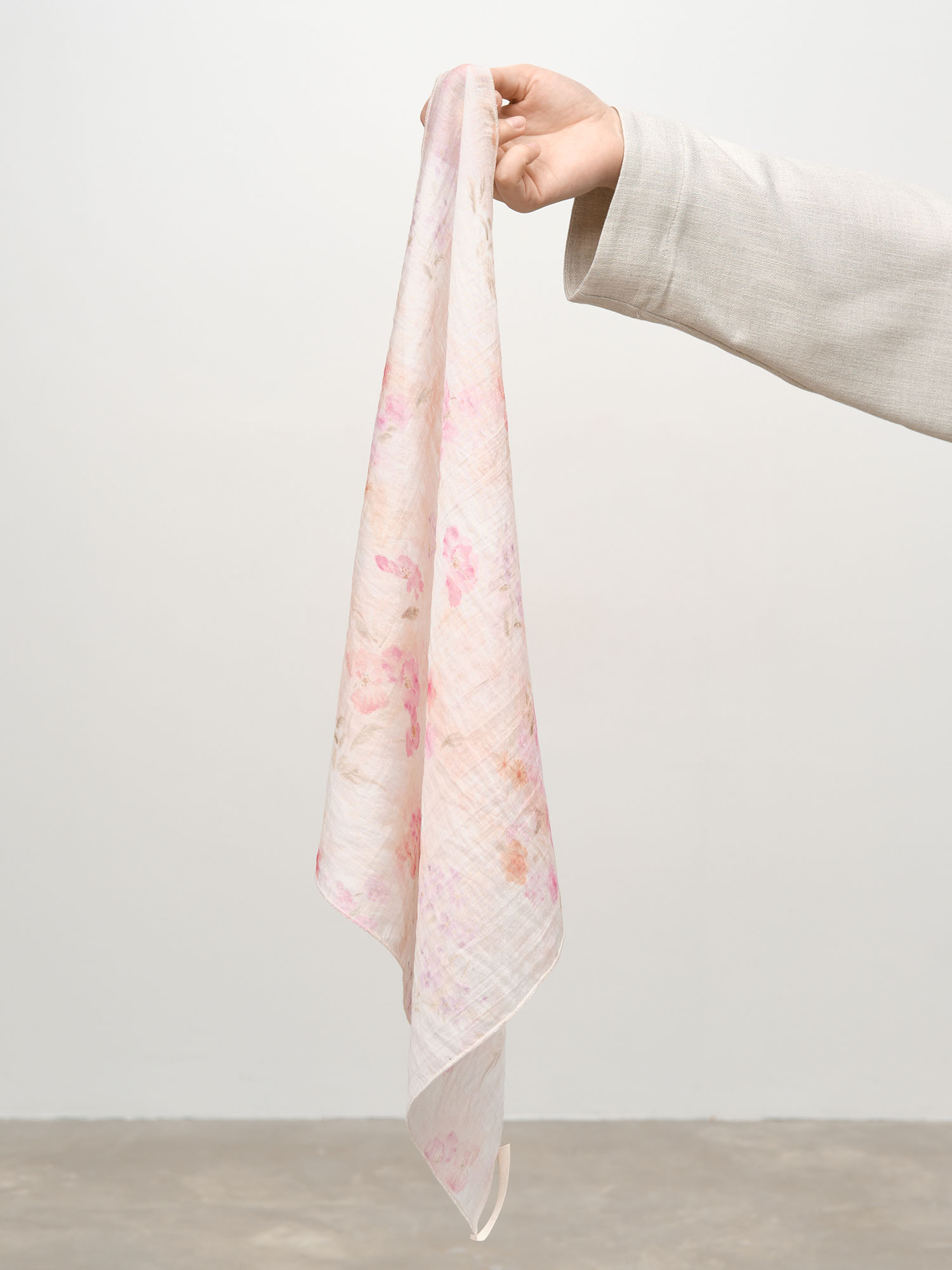 Легкий струящийся платок с аккуратно обработанными краями и утонченным принтом. Универсальный формат позволяет носить его разными способами.