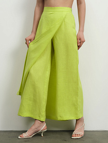 Модель с запахом спереди и сзади, аккуратная посадка по талии, легкая фактурная ткань, мягкие складки, скрытая конструкция брюк.