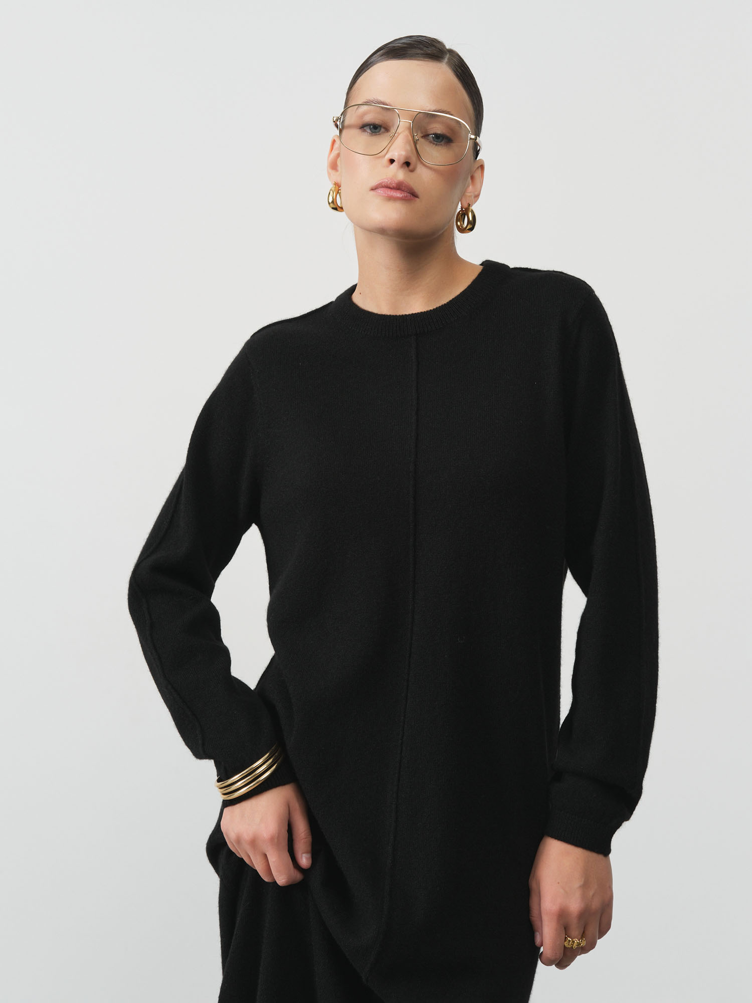 Модель выполнена в прямом силуэте с округлой горловиной и длинными рукавами. Лаконичный крой подчёркивает современный стиль и универсальность изделия.